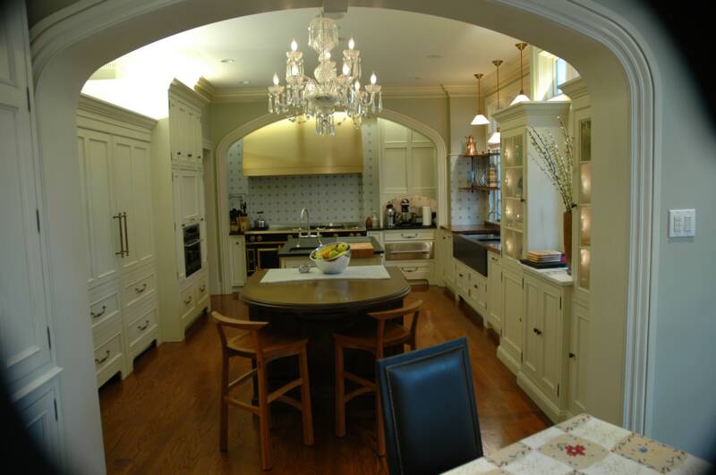 solid teak countertop with draining grooves sitting over a honed black granite sink surround supporting two stainless steel undermount bowls