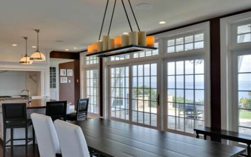 The East wall is floor to ceiling windows so the working area is set to the left of the range and the island.